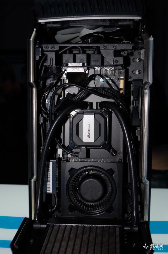 不过好在海盗船ONE的内部没有任何风扇散热,它只是在机箱顶部设了一个机箱风扇,内部配件除显卡外全部采用水冷方案解决(ONE PRO型开始连显卡都是水冷),所以不存在风道的问题,也让它的工作噪音低到难以察觉,在闲置运转时整机噪声才有20分贝。但也正是因为如此,海盗船ONE只能立着使用,不能放倒运转,因为它的两边都有散热通风孔。