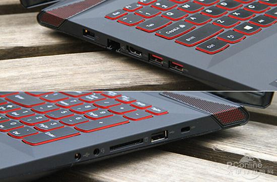 大尺寸机身带来了丰富的接口设定,联想Y50p-70的机身左侧设置有电源插口、RJ45、HDMI以及2个USB3.0接口,在机身右侧我们还可以看到有数字音频、耳机麦克风插口、SD读卡器、USB2.0以及安全锁孔。联想煞费苦心的将USB3.0接口从蓝色改变为红色,为的就是让它与Y50的整体配色相匹配,从而达到了浑然一体的效果。