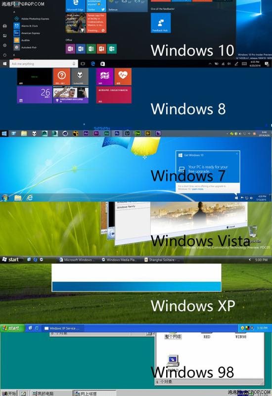 回过头来看 Windows,自 Windows 98 以来,Windows 的每一次重大改变都有着界面上的革新,微软在界面设计上有着非常多的尝试,从 Windows XP 的彩色风格到 Windows Vista 的酷炫风格,再到 Windows 7 的磨砂玻璃风格、Windows 8/8.1 的大色块风格,微软的每一次改变都会给当时的界面开发带来新的设计思路。直到最新的 Windows 10,微软才终于来到了苹果一直推崇的极简设计界面,虽然整体上多多少少依然有一些 Windows 8 的大色块风格,但是所有的模块都能够传达一些有用的信息,比普通的图标更为高效。