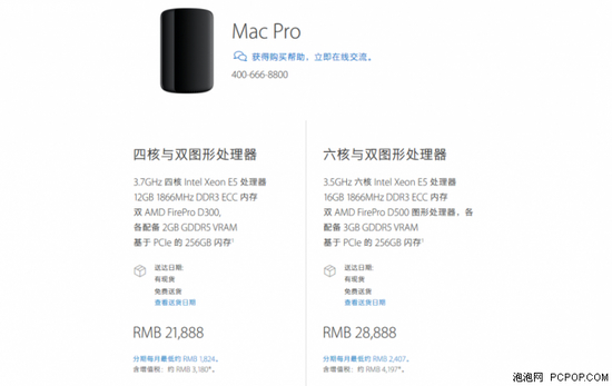 Mac Pro 的低配版搭载四核心 Xeon E5 处理器,睿频可达 3.9GHz,标配12GB DDR3 ECC 内存,配备双 AMD FirePro D300 图形处理器,256GB PCIe 闪存,售价为21888元。