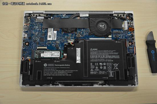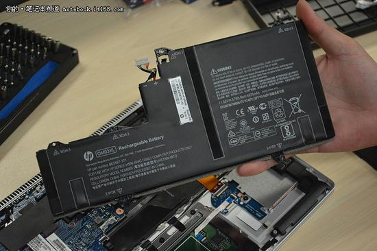 在拆机测试中,我们可以看到HP EliteBook x360内部结构十分规整,而最令人惊讶的是该机电池面积占笔记本面积的一半,十分惊人,不过这也确保了该机拥有足够长的续航时间,我们后续会重点说明。
