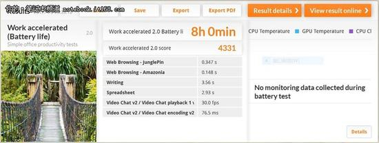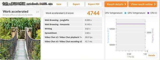 整机性能,我们通过PC Mark 8在work环境的测试,模拟用户日常办公的行为习惯,最终测出整机分数为4744分,这个分数并不是很高,但却足够保证了其在轻薄本中的地位。