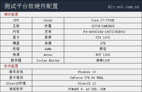 本次测试采用平台配置为:英特尔i7 7700K处理器、技嘉Z270主板、索泰GeForce GTX 1080显卡、希捷2TB机械硬盘、安钛克电源。