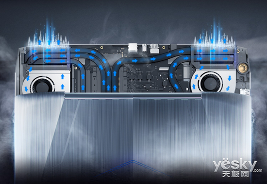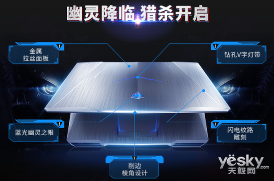 作为一款高端游戏本,雷神Dino-X6在外观上可以说是做足了功夫!该机在外观设计上借鉴了行星飞行器的灵感,结合概念性的设计塑造出了更具未来感的线条与肌理,让该机得以拥有28mm的厚度和不足3kg的重量;机身A面采用金属拉丝工艺,优化了整机的品质表现与直观触感;脊背双侧扰流造型,使用CNC后处理加工而成,工艺繁琐但造型精良。