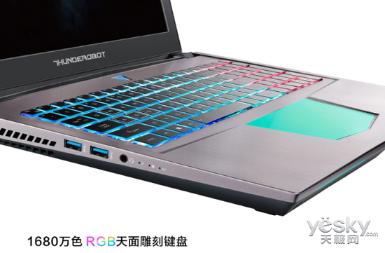 此外,该机还首次采用了大面积全透极光不规则一体式触摸板,彰显了十足的科技感和未来感。而在键盘的设计上,该机搭载了一块1680万色RGB全彩背光天面雕刻键盘。该键盘经过喷漆印刷镭雕等多道工序,使得每个键帽侧边均匀发光,1680万色随心调、更可以通过专用软件设置闪烁、呼吸、心跳等多种动态效果,打造只属于自己的RGB自由光域。