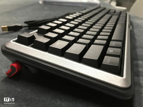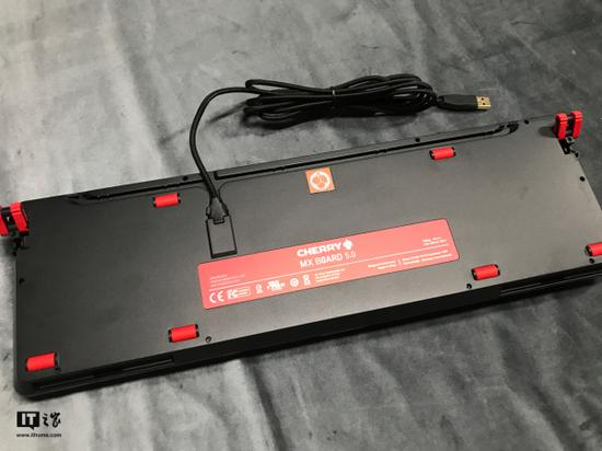 Cherry MX BOARD 5.0键盘背面有八个红色的脚垫,其中6个固定的,2个是可以活动的,并且采用转轴的方式能够调节键盘与桌面之间的倾斜角度。除此之外,键盘的靠近中间背面内置了USB键盘线,在连接线的导出方面,键盘里分为三条凹槽供采用不同的选择,其实大家直接使用默认的直出线凹槽就比较好,不过具体情况请视使用环境而定。