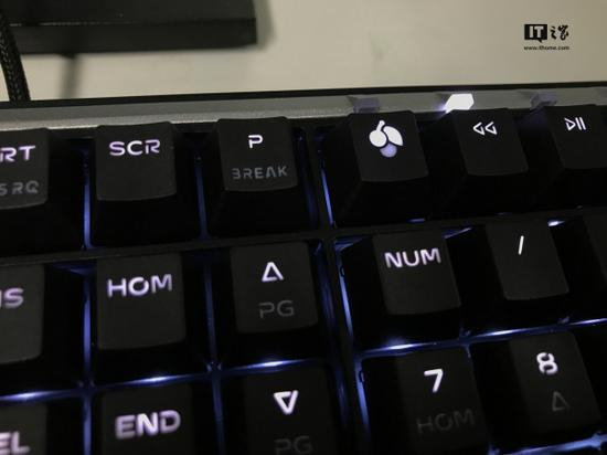键盘的右上角是4枚多媒体按键,另外右上角外侧分别也有四枚指示灯,樱桃Logo对应为红色,后三个为白色。指示灯比较小,上面标注数字、字母,1代表数字区开关,C代表字母大小写开关,S代表Scroll Lock屏幕滚动锁定开关。和MX BOARD 1.0类似,MX BOARD 5.0的方向键区域同样做了钻石面切割设计,起到点缀的效果。