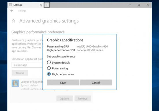在Build 17093版本中,为多显卡设备引入了全新的图形设置选项,允许根据应用程序来管理显卡性能偏好。用户可以在设置 > 系统 > 显示中向下滚动访问“高级显卡设置”链接。
