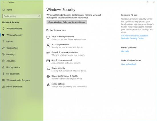 在设置 > 更新&安全中,“Windows Defender”已经更名为“Windows Security”。这个设置页面已经进行过重新设计,涵盖了多个重点保护区域从而确保设备处于安全状态。