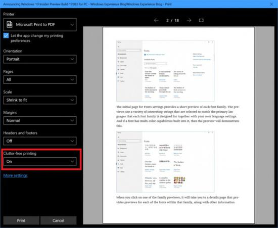 现在Edge浏览器打印网页的时候支持无广告没有其他干扰元素。用户在打印设置中激活“Clutter-free printing”打印,就只会打印出你所需要的内容。注意的是,这项功能目前仅支持部分类型页面。