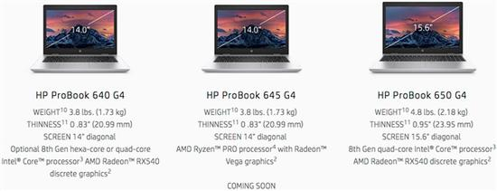 新系列也有三款型号,ProBook 640 G4、ProBook 650 G4采用Intel七代或八代酷睿处理器,可选AMD RX 540独立显卡,ProBook 645 G5则是配备AMD Ryzen Pro APU+Vega GPU。
