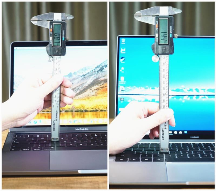 上图为华为MateBook X Pro的机身厚度,下图为2018款MacBook Pro的机身厚度。