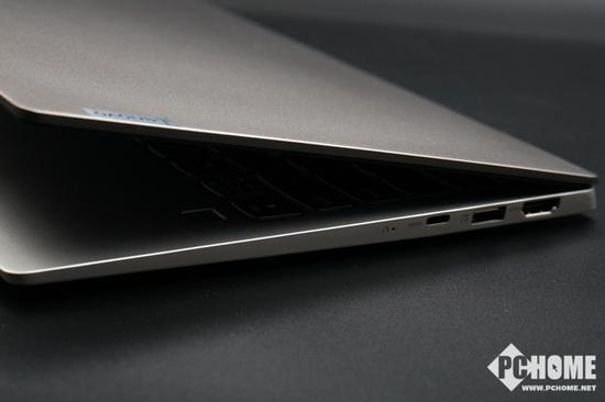 扩展接口方面,机身右侧配备了一个USB Type-C、一个USB3.0和一个HDMI视频输出接口;机身左侧依次为电源接口、USB3.0以及一个3.5mm耳机接口。在机身如此轻薄的情况下,还配备了两个标准USB接口及HDMI接口,更加方便连接外设。