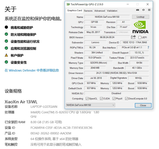 显示芯片方面,全新联想小新Air 13采用了NVIDIA GeForce MX150显卡,基于Pascal架构打造,GP108核心。配备384个显示单元,核心频率937MHz,加速频率1038MHz,配备2GB GDDR5显存,位宽为64Bi。