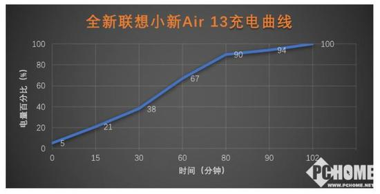 此外,该轻薄本还支持快充,通过实际测试,一小时内,即可将笔记本电量从5%充到67%,80分钟即可将电量充到90%,全部充满用时102分钟,充电效率还是非常高效的。尤其是前60分钟内,充电速度非常快,可以满足紧急情况下的充电使用。