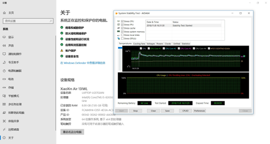 稳定性方面,我们采用AIDA64自带的系统稳定性测试来检验整机在持续满载状况下的情况,在进行一段持续时间长达30分钟的拷机测试之后,显示CPU温度保持在67°C,最高温度在70°C以下,所以全新联想小新Air 13的散热也大可以放心。