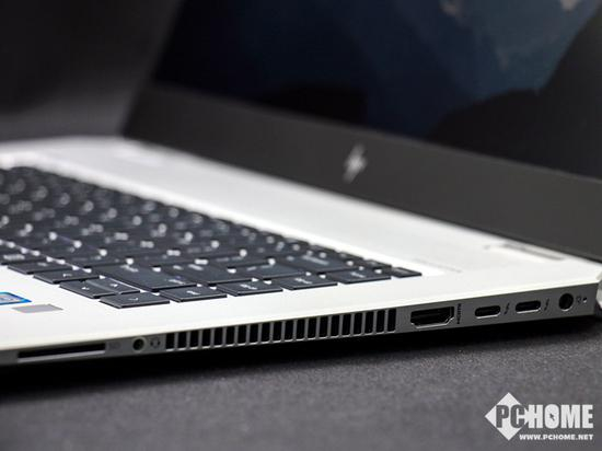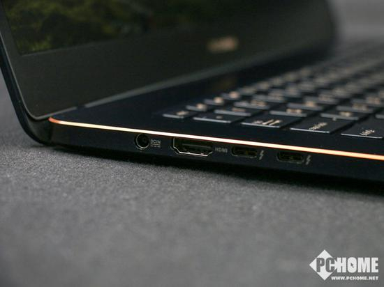 机身右侧配备2个USB Type-C接口、HDMI视频输出接口、SD读卡器及音频接口,机身左侧配备2个USB 3.1接口,不过两个接口间距较近,同时插两个体积较大的U盘时可能会有干涉。还要说的一点是,散热出风口设置在机身两侧中部,无论你是左手还是右手,在使用的时候吹出的热风都会被吹到,冬天还好,夏天的时候就会影响舒适操作了。