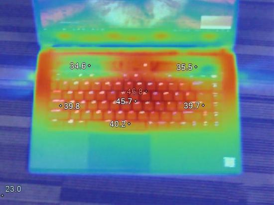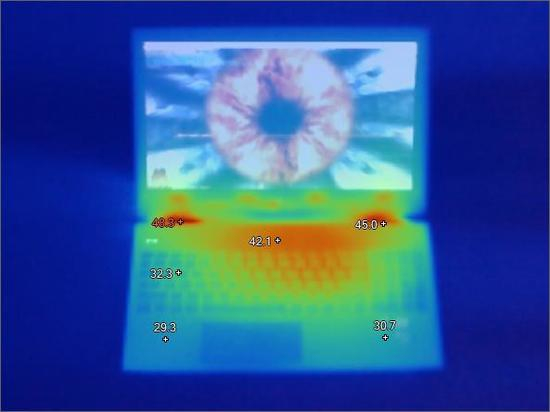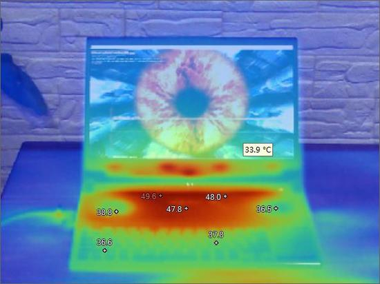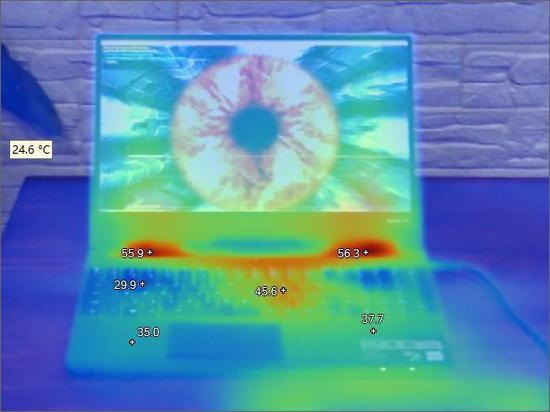 散热性能是考验游戏本优劣的一项重要指标。我们将室温控制在20-25℃左右,让每款游戏本的处理器和显卡满负载运行半个小时左右,来看看这几款产品机身的表面温度的分布。