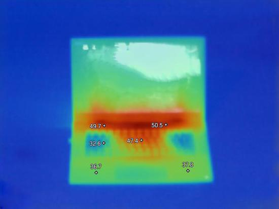 雷蛇 灵刃15在运行半小时Furmark后,C面最高温度在50℃以上,热量主要集中在C面上部,而键盘WASD位置温度控制在30℃,手托位置也在40℃以内,无烫手情况。