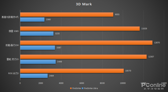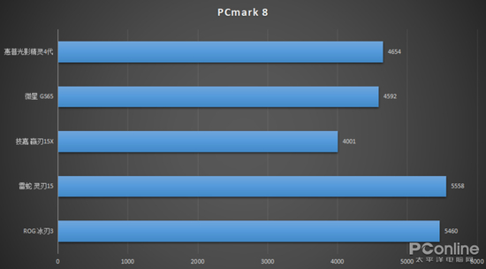 在PCmark8的测试中雷蛇 灵刃15与ROG 冰刃3成绩较为相近分别为5558和5460占据榜首,而技嘉 赢刃15X则以较大差距排在最后。