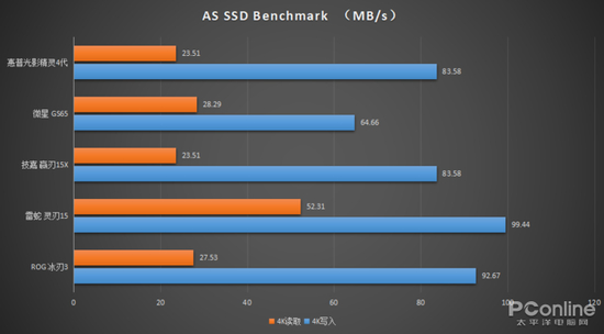 在测试硬盘性能时,我们主要对比这几款游戏本的主硬盘——固体硬盘的持续读写速度。现在NVMe接口的接口硬盘已经是比较普及了,从图中我们可以看到,在硬盘测试中雷蛇 灵刃15的4K读写速度有微弱优势,而微星GS65成绩再次垫底。