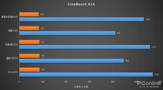 从柱状图中我们可以清晰的看出这几款笔记本的单核成绩相近,无明显差距,而多核成绩差距偏大。其中ROG 冰刃3以多核总成绩1141cd/单核174cd占据优势,而微星821cd/167cd明显落后。