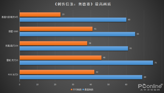 在最高画质的《刺客信条:奥德赛》的游戏测试中,雷蛇灵刃、ROG 冰刃3和微星GS65的平均帧数在40以上最高帧数都在60帧以上,游戏画面较为流畅,不过在地图切换或是打斗过程中会出现些许卡顿现象。惠普光影精灵4代则因为显存较低平均帧数仅有23帧,无法流畅运行游戏。