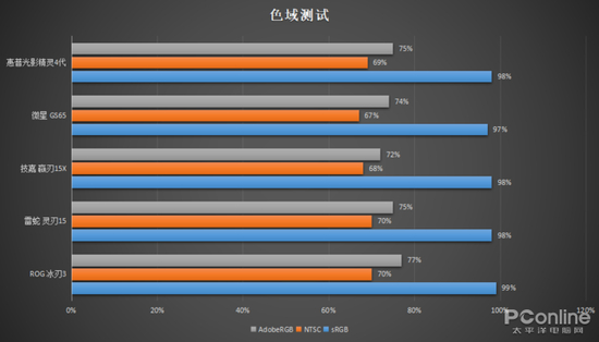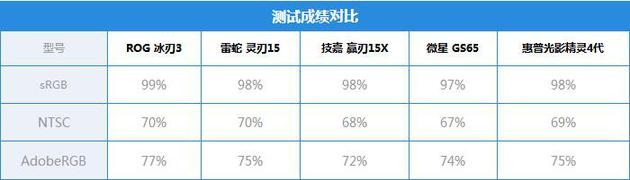 我们通过Spyder5来测试这5款产品屏幕的色域大小,经过测试我们可以清楚的了解到,这5款产品屏幕色域基本相同,sRGB都达到了98%左右。