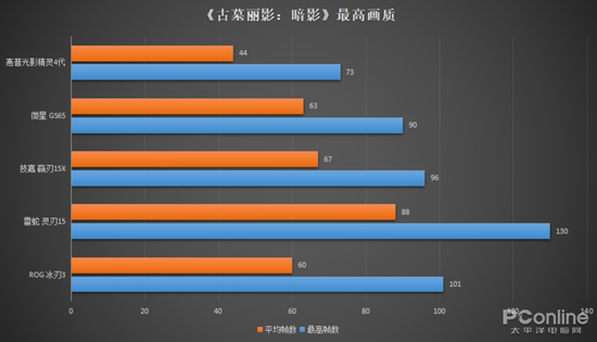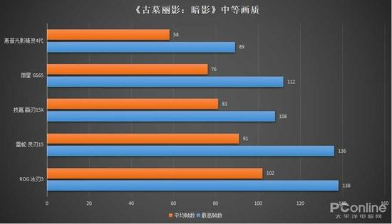 此次参与横评的五款轻薄游戏本均可以流畅运行中等画质的《古墓丽影:暗影》,其平均帧数都到了55帧以上,其中ROG 冰刃3根式达到了平均102帧的好成绩。