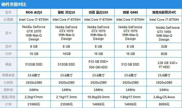 整体来看这五款笔记本均采用8代酷睿i7标压处理器——Intel Core i7-8750H,而显卡方面惠普光影精灵所搭载3GB显存的Nvidia GeForoce GTX 1060 With Max-Q Design与8GB内存,明显要弱于另外四款8GB显存的Nvidia GeForce GTX 1070 With Max-Q Design显卡搭配的16GB内存,在图形处理方面占据下风。