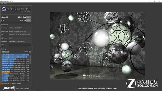 首先是处理器测试,i5-8400处理器是一颗六核心六线程的高性能处理器,采用14nm制程拥有9MB三级缓存,主频最高能达到2.8GHZ。笔者使用CINEBENCH R15对其进行测试,最终OpenGL得到90.61FPS、CPU得到904cb的成绩,从成绩中可以看出,i5-8400的性能得到了很好的释放。