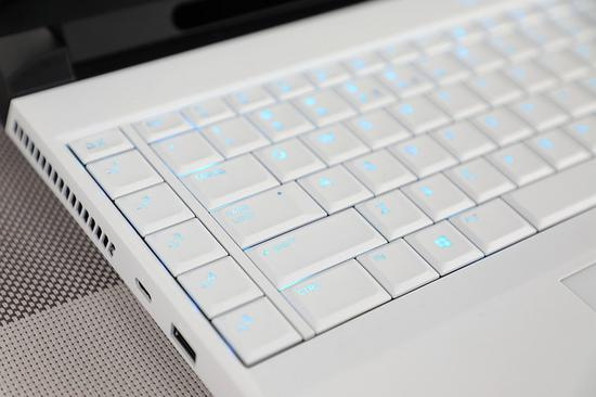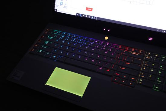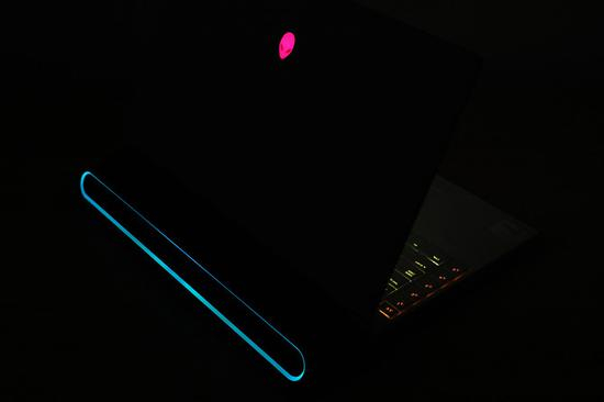 相比上代产品,C面在布局上的变化并不大,但是包括键盘都采用了类肤质涂层,减少“刚性”的同时也增加了阻力,所以在激烈的游戏中再也不用担心手打滑了。顶部是带有灯效的外星人LOGO,同时也是电源按键。值得一提的是,包括键盘、触控板都支持AlienFX情绪同步灯效,而且比较柔和,很有亲和力。同样,通过Alienware Command Center(简称AWCC)应用可以设置自己喜欢的各种色彩。