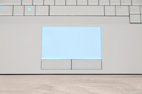 左右双按键分体触控板,磨砂玻璃,灯效可设。虽然触控板的面积并不大,但是使用起来非常顺滑,操控精准、跟手,不拖泥带水。如果外接鼠标操控游戏担心触碰到触控板,也可以通过F11 T-PAD快捷键关闭。