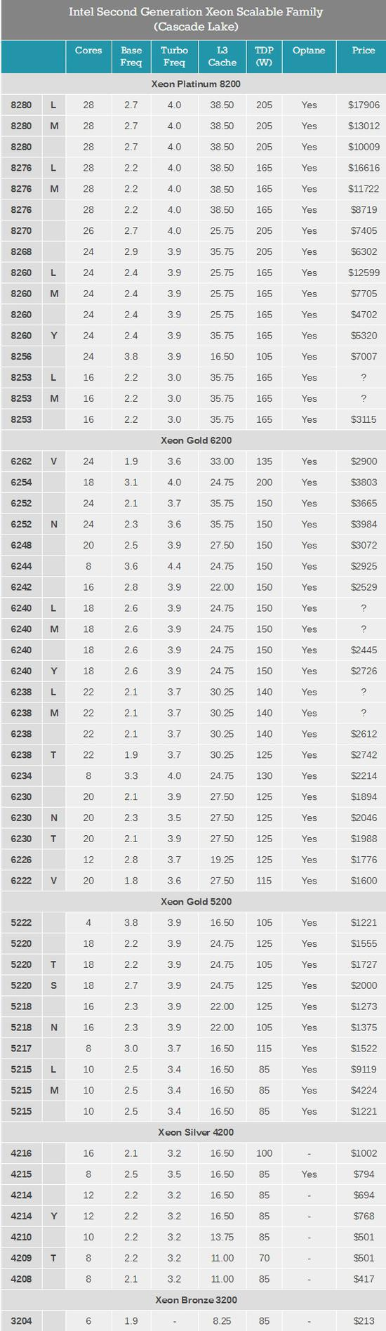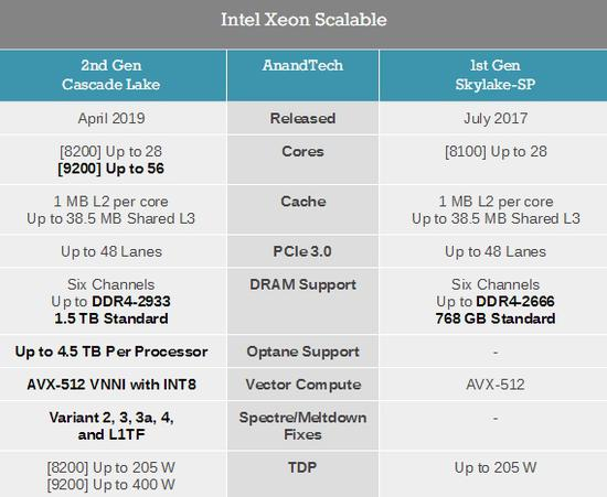 - 新增代号Cascade Lake-AP的铂金9200系列,内置两颗Die,最多56核心112线程,热设计功耗最高400W