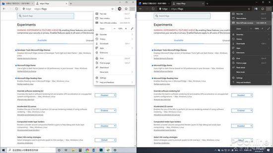 新版Edge浏览器的夜间模式(左:正常模式,右:开启夜间模式)