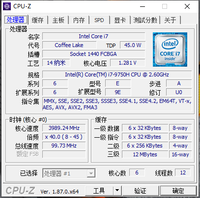 英特尔九代酷睿i7-9750H,2.6GHz,睿频可达4.5GHz |