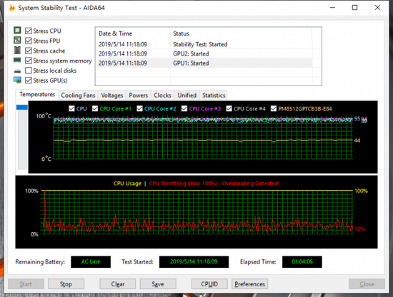 双高精度涡轮风扇+5根导热铜管配置的散热效果到底如何呢?我们用AIDA64拷机软件稳定性测试勾选CPU+FPU+cache+systemmemory+GPU进行拷机测试,拷机时间为1小时。在拷机的1小时过程中,并未发现降频的现象。