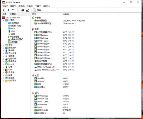 1小时后,我们从拷机结果可以看到CPU的温度为95°,功耗为58W,GPU温度为86°,功耗为115W,由此来看,机械革命深海泰坦X9Ti-R散热模组的散热效果还是比较理想的。