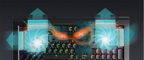 作为一款专业电竞游戏本,散热是非常重要的部分。机械革命深海泰坦X9Ti-R的散热模组采用了双高精度涡轮风扇+5根导热铜管配置,配合四向出风口大风量导流,可以更有效的导热。