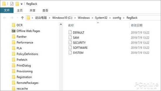 重启系统后,Windows 10会自动在每次开机时备份注册表,通过“C:\Windows\System32\config\RegBack”可以查看到最新版备份文件。