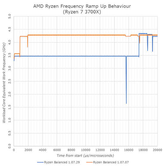 AnandTech 对两版驱动进行了快速 A / B 测试,发现在更新之前,CPU 会在大约 840 微秒内飙到较高的动态频率 —— 相比之下,更新后的电源计划,其所花的时间要多出 17.5 ms 。