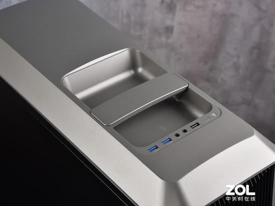 除了整个机箱设计比较轻便之外,这款机器的机箱顶部还配有把手,搬运时候更为省力和便捷。另外把手部分的下方也可以当做储物舱来使用,防止一些U盘、硬盘等外设不成问题。