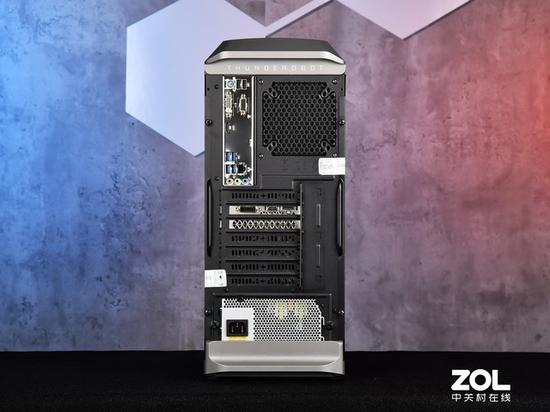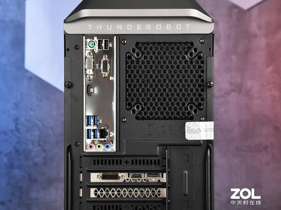 机箱背部主要是接口分布区域,主板自带PS/2接口,2个USB 2.0接口、VGA/DVI/HDMI视频接口,另外还配有4个USB 3.1接口、RJ-45以太网口以及3个音频插孔。