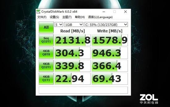 硬盘部分,911黑武士Ⅱ代配置了一块256GB NVMe SSD+1TB HDD的双硬盘组合,兼顾速度和容量。通过CrystalDiskMark对SSD进行测试,可以看到持续读取速度2131.8MB/s、持续写入1578.9MB/s,性能表现属于中高端水准。