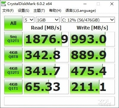 硬盘方面,战66 三代采用了512GB PCIE×4 SSD,容量很大。测试得到持续读取1876MB/s,持续写入993MB/s。最令人吃惊的是这块固态硬盘的4K速度,随机读取65.33MB/s,随机写入竟高达211.1MB/s。要知道,即使是旗舰级别的固态硬盘,其4K随机写入也就在120MB/s左右。从这一项数据上可以看出,战66 三代应该采用了搭载最新技术的固态硬盘,4K随机性能太强大了。