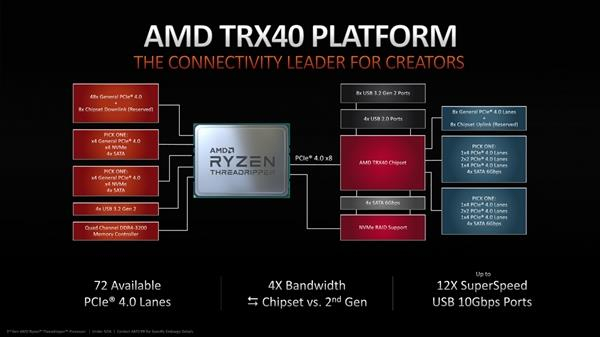 AMD指出,新一代锐龙TR处理器及sTRX平台支持多达88条PCIe 4.0通道,而且连接CPU和芯片组的接口吞吐量提升了三倍,这些要求跟X399平台是不一样的。