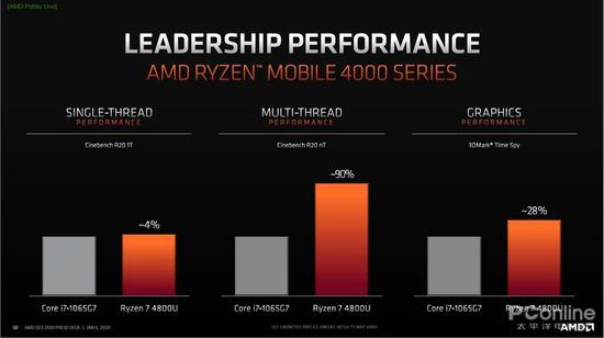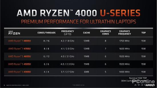 U系列处理器TDP均为15W,其中旗舰型号Ryzen 7 4800U为8核16线程设计,12MB缓存,基础频率1.8GHz,可BOOST加速至4.2GHz。
