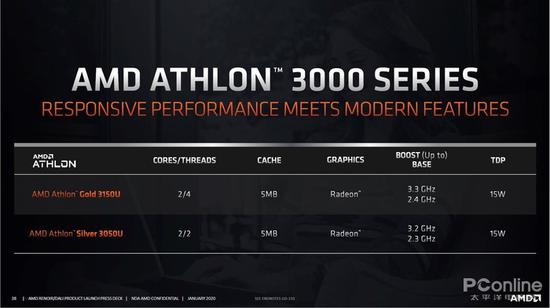 另外还有速龙Gold 3150U与Silver 3050U处理器发布,定位入门级,均为双核心设计。