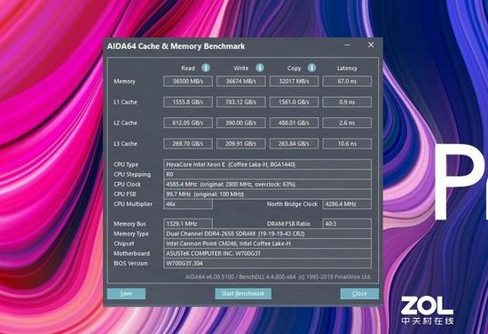 华硕ProArt Q17搭载了2×32GB DDR4 2666 ECC内存,以下是其读写、拷贝与延迟性能的测试结果: