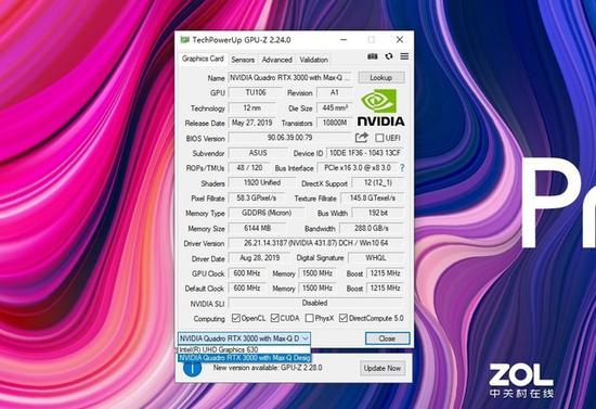 ProArt Q17搭载的NVIDIA Quadro RTX 3000 Max-Q拥有1920个流处理器、6GB GDDR6显存、192bit显存位宽。由于支持光线追踪,因此它还拥有30个RT核心和240个Tensor核心,总体性能非常不错。